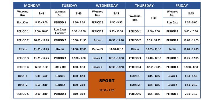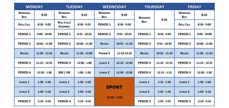 Our school day is structured around a clear timetable. We have set times for learning sessions, activities and lunch. Understanding the bell times helps students get the most out of each part of the day.